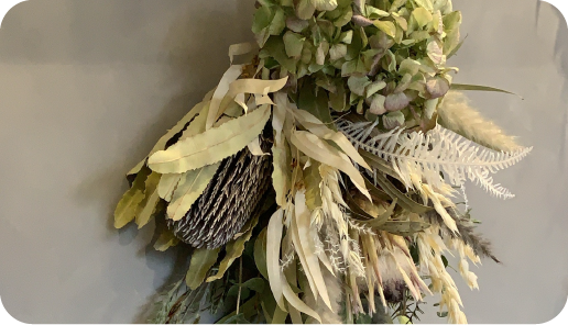 スワッグとはドイツ語で『壁飾り』。 壁に飾りやすいように、背面が平らに仕上がっている花束。 壁飾りとしてはもちろん、花瓶に挿しても飾れ、 ご自宅用にもお誕生日やご開店祝いなど贈り物としても人気のアイテム。